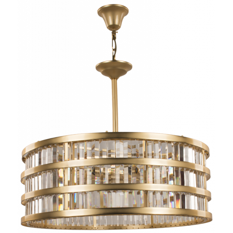 Runde geometrische Form, grosse rechteckige Bleikristalle. Höhenverstellbar, 8 Leuchtmittel, 243 Kristallteile, Farbe: Goldlack.